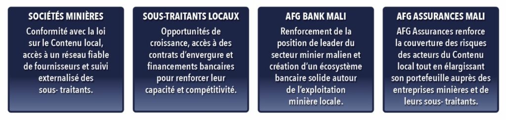 - Positionner AFG Bank Mali comme moteur du financement minier local et modèle de mobilisation pour l’ensemble du secteur bancaire autour des sous-traitants maliens.
