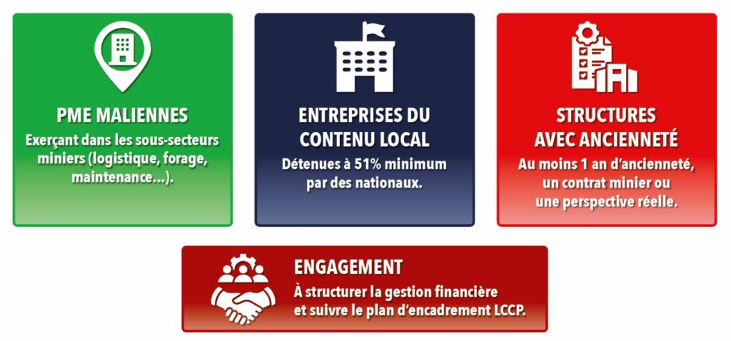 Le LCCP cible deux catégories précises : les PME maliennes et les entreprises du Contenu local. Les premières regroupent l’ensemble des sociétés opérant sur le territoire, qu’elles soient à capital national ou mixte. Elles constituent la base productive du secteur, celles qui assurent au quotidien le transport, la maintenance, la logistique, le forage ou les services généraux liés à l’exploitation minière. Les secondes, les entreprises du Contenu local, répondent à la définition fixée par la loi : une majorité du capital détenue par des Maliens. Ce statut leur confère un rôle central dans la redistribution de la valeur et dans l’ancrage durable des richesses créées au Mali. Cette distinction reflète la diversité des bénéficiaires visés par le programme : elle permet d’intégrer à la fois les acteurs déjà installés et les structures à capital national, dans un même dispositif d’appui. Chaque catégorie y trouve sa place selon son niveau d’activité, son expérience et sa capacité à suivre le plan d’encadrement du LCCP. S’y ajoutent les structures disposant d’une ancienneté minimale – au moins un an d’activité, un contrat minier en cours ou une perspective crédible d’obtention. Toutes les entreprises sélectionnées s’engagent à structurer leur gestion financière et à suivre le plan d’encadrement LCCP, condition commune et principe directeur du programme. Cet engagement fait du LCCP un dispositif d’équilibre : financer, accompagner et pérenniser les acteurs capables de s’inscrire dans la durée.