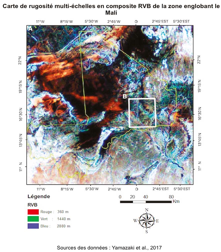 *(Illustration: Multi-scale RGB composite roughness map of the area encompassing Mali – Data sources: Yamazaki et al., 2017)*